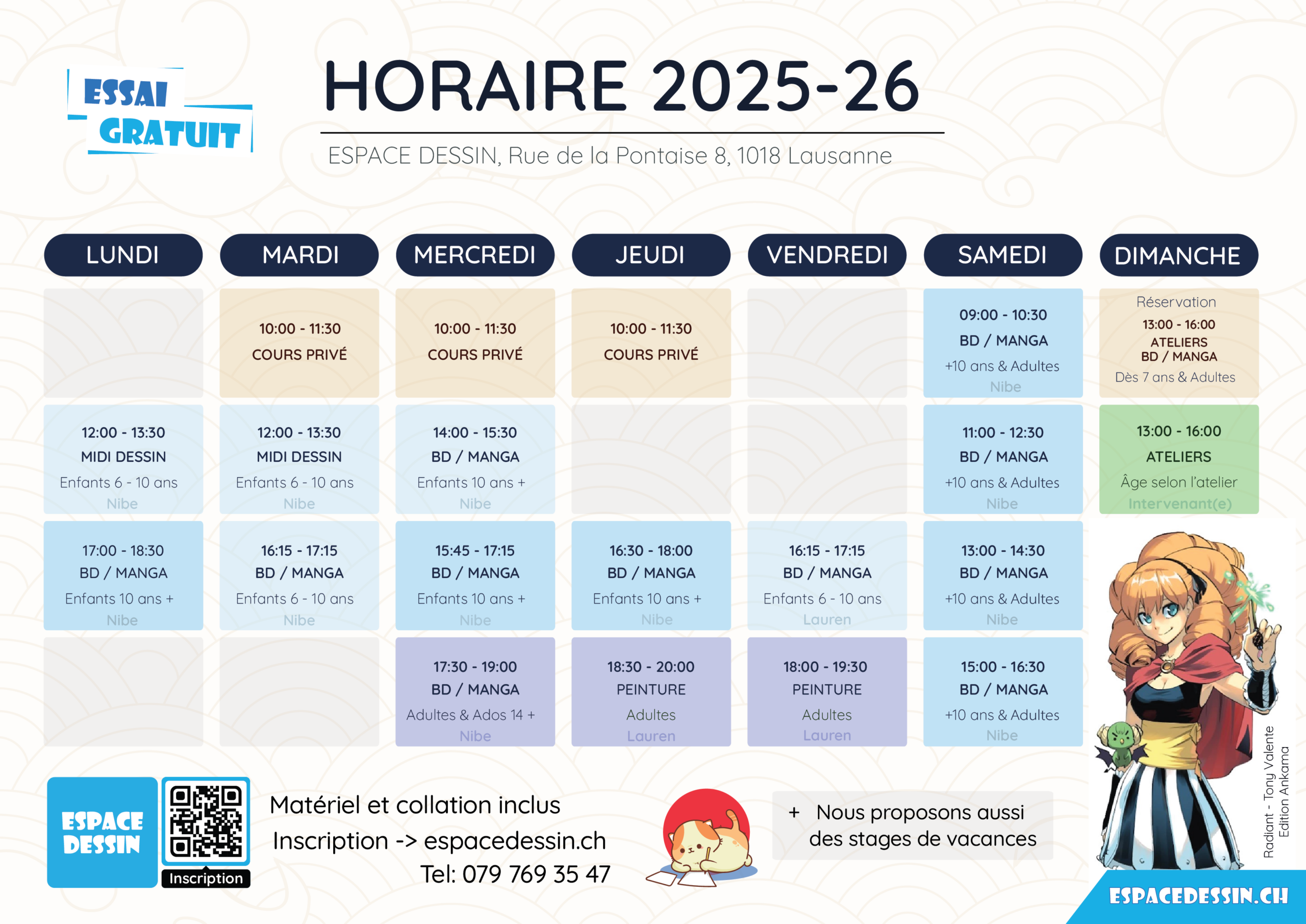 250 CHF la semaine ( 5x demi journées de 3h ) et 220 CHF pour le deuxième enfant de même fratrie.
